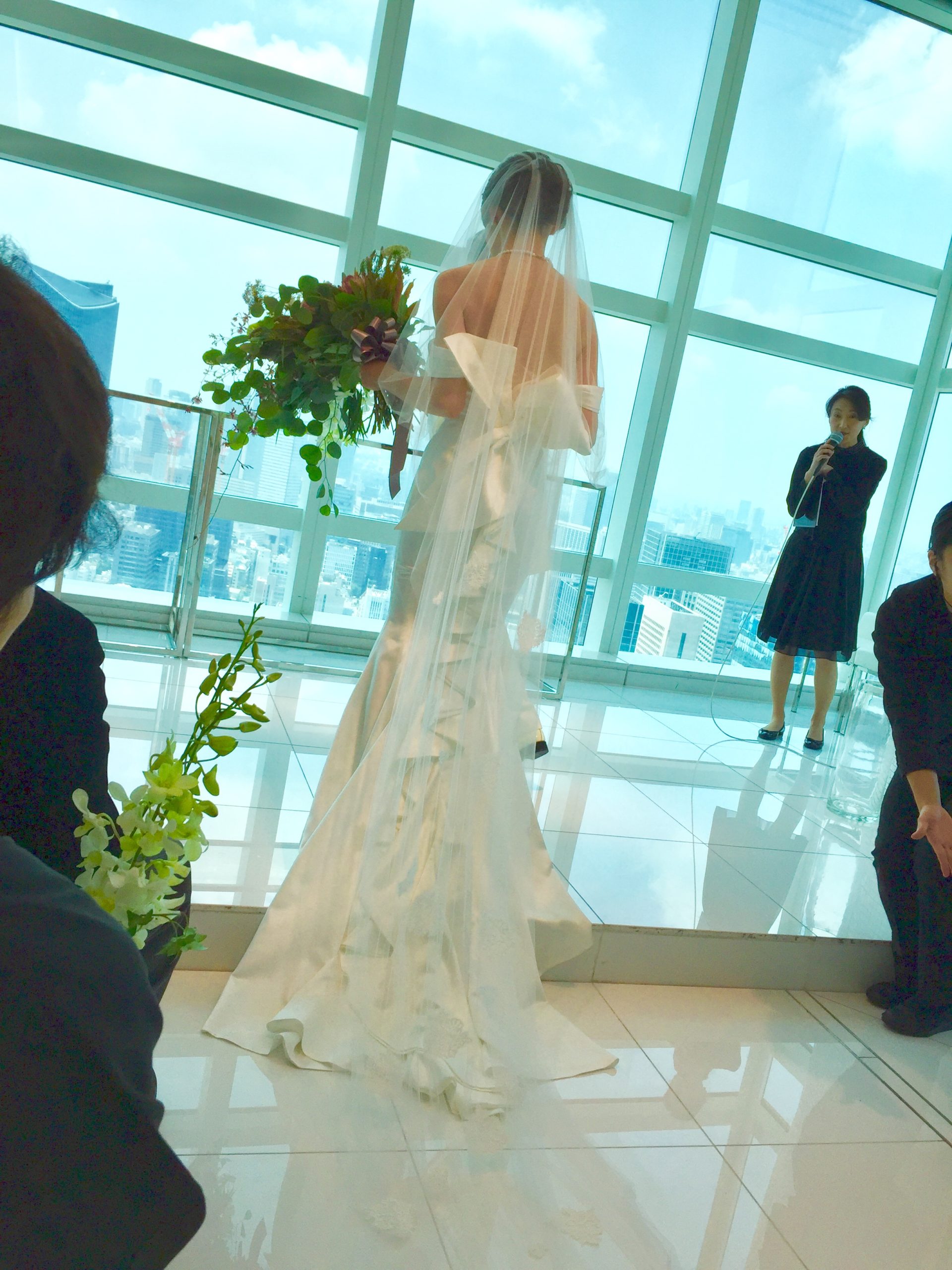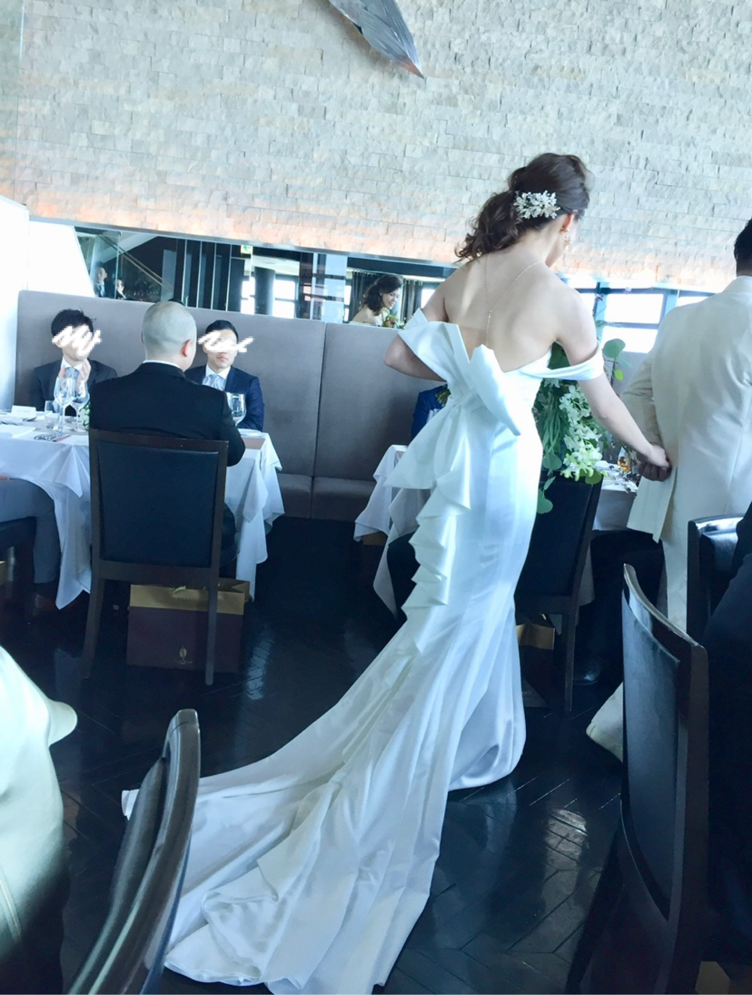 オフショルダーのマーメイドドレスです。大きなブーケに合わせて前は飾りのないシンプルなデザインにして後ろにデザイン性を持たせています。後ろのリボンは丸みや膨らみの出ないようにすっきりとまとめることで全体的にシャープな印象にしています。