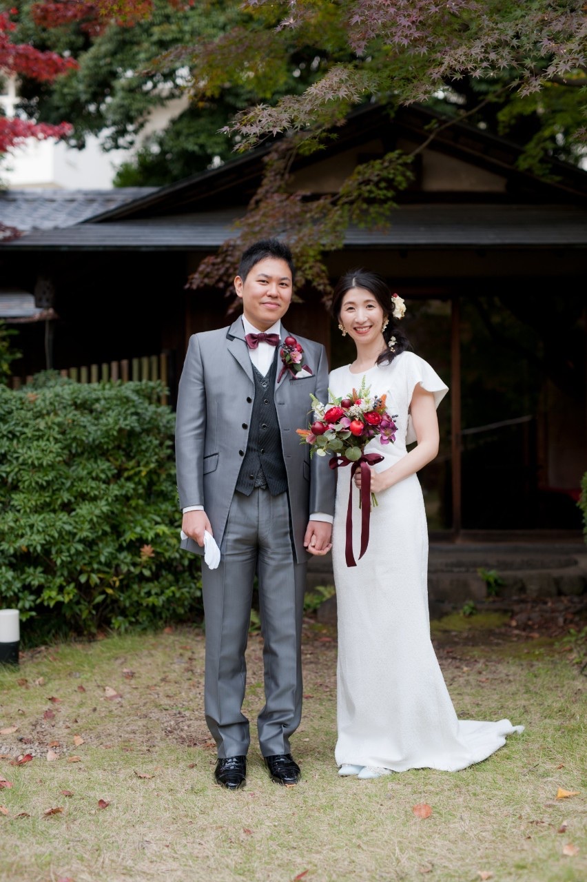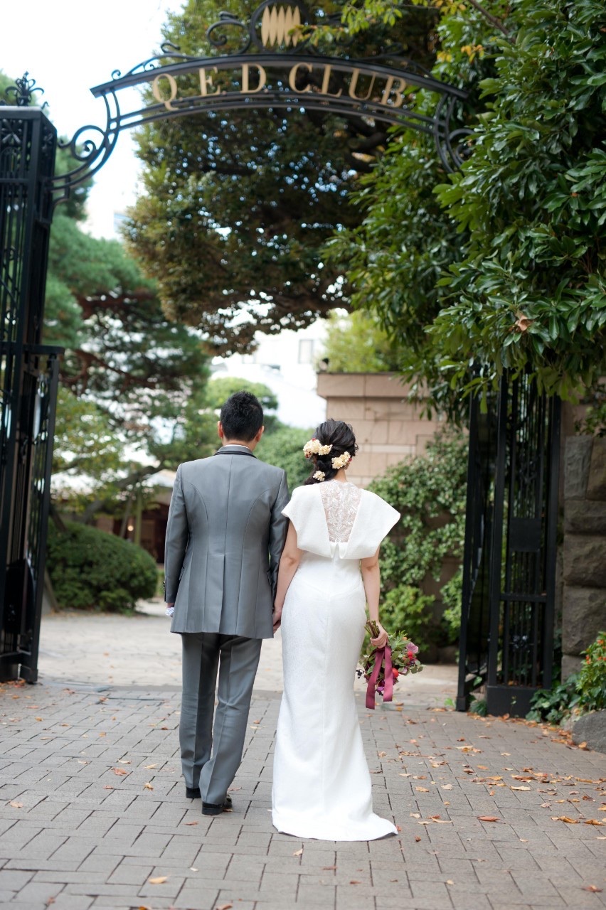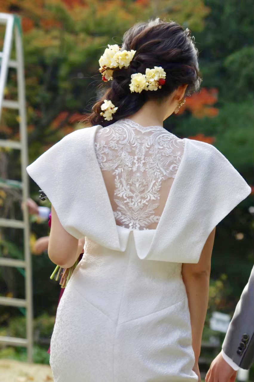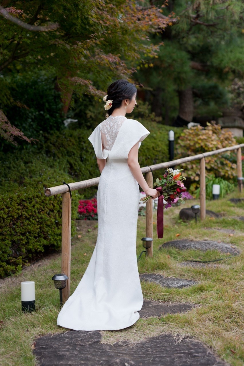 背中空きのストレートラインのドレスです。ヒップから裾に向かって絞りがなくまっすぐなシルエットのドレスをストレートラインやアイライン(アルファベットのⅠ)と呼びます。コンパクトで動きやすいのでガーデンウエディングやレストランウエディングにもお勧めです。背中の空きにレースを施して、抜け感はありつつも露出を抑えたデザインとなっています。