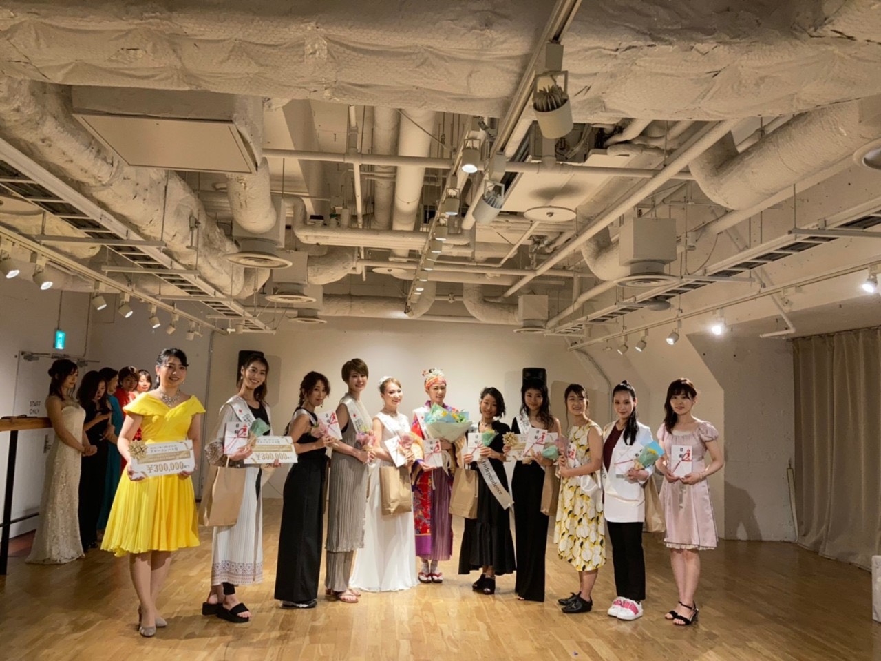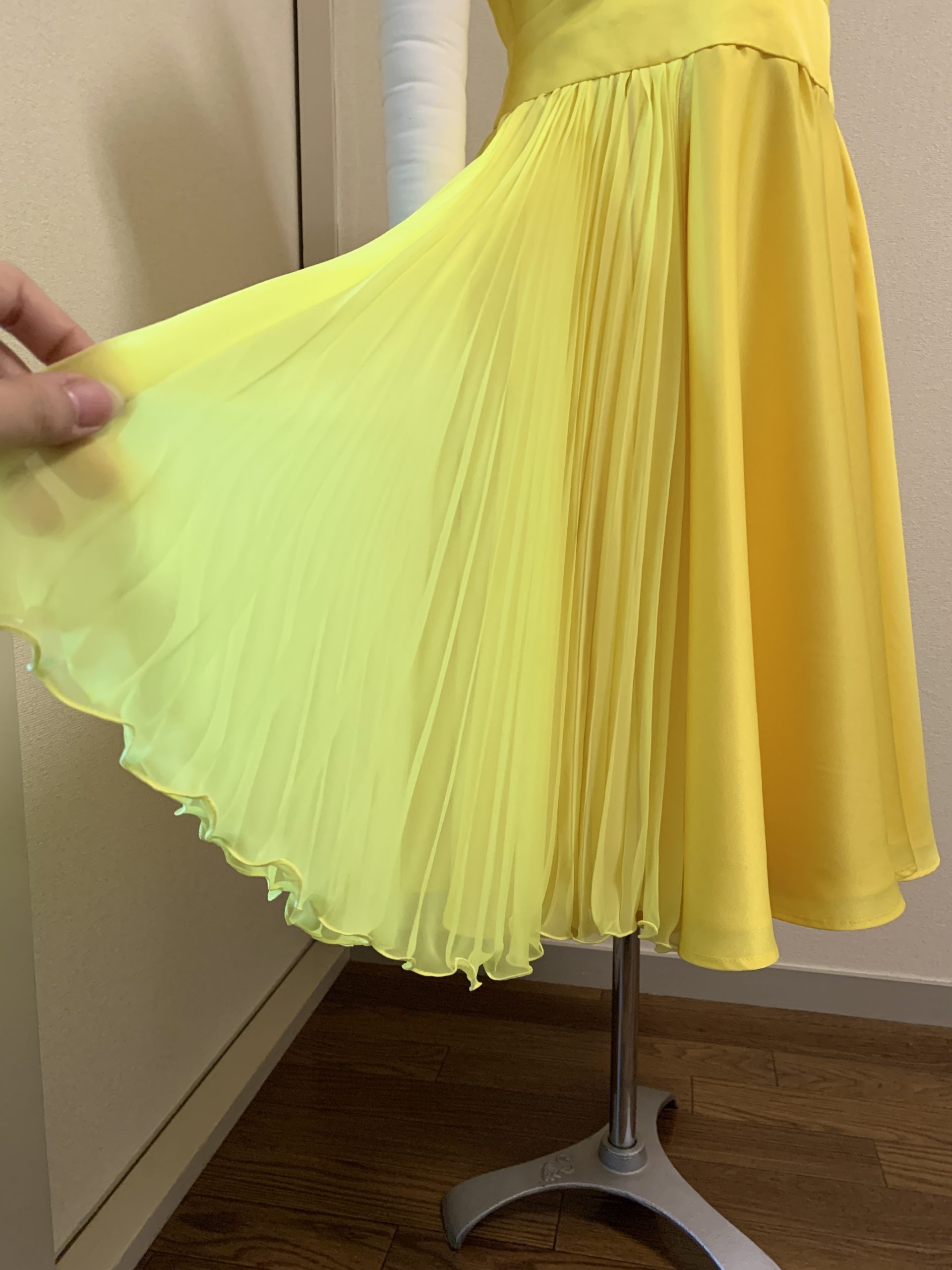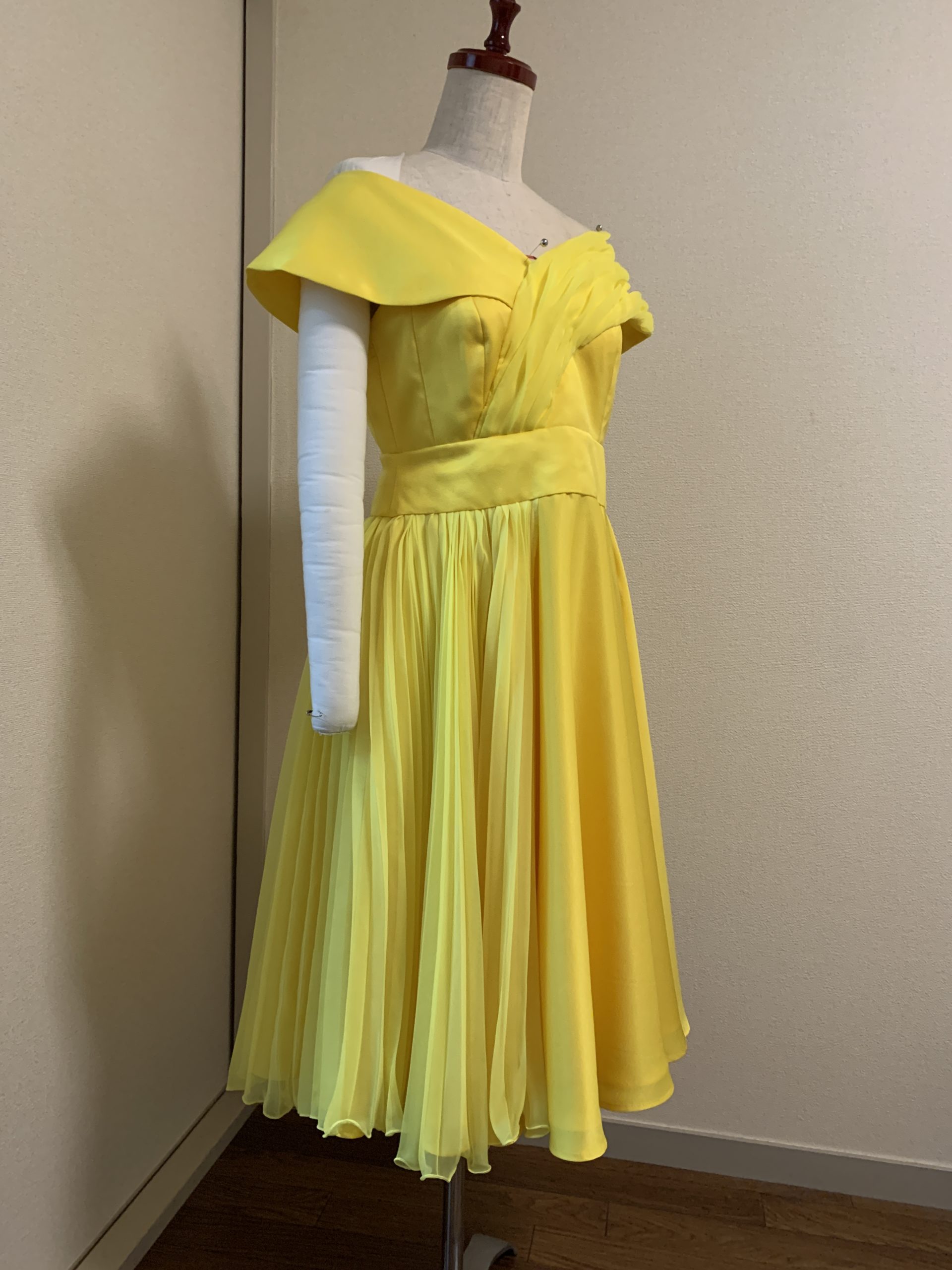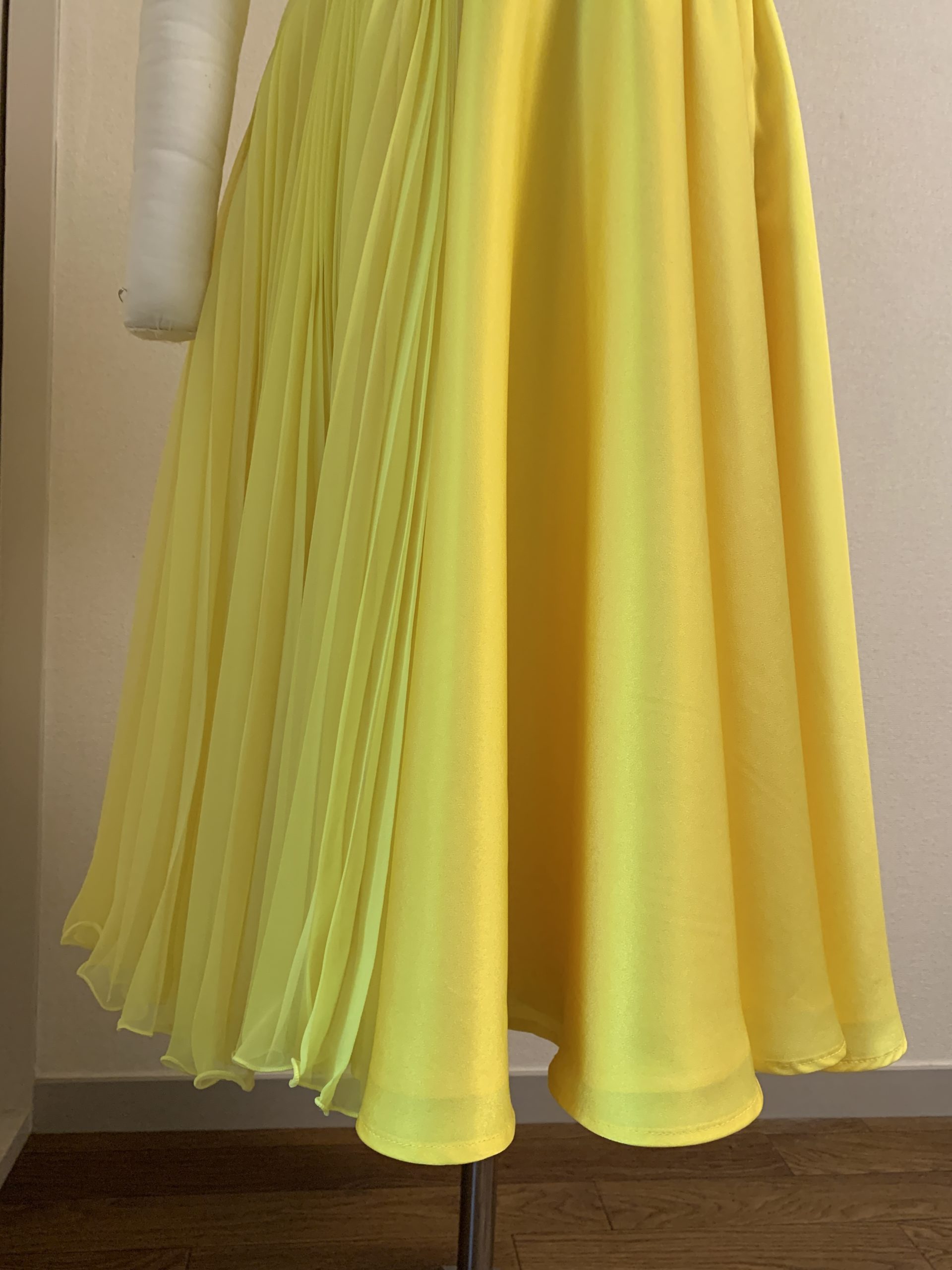コンテストで着用された鮮やかなイエローのフルオーダードレスです。サーキュラースカートにジョーゼットのプリーツを付けて縦のラインを強調しました。通常よりやや薄いサテンを使用してウォーキングで軽やかに揺れる動きを出しました。