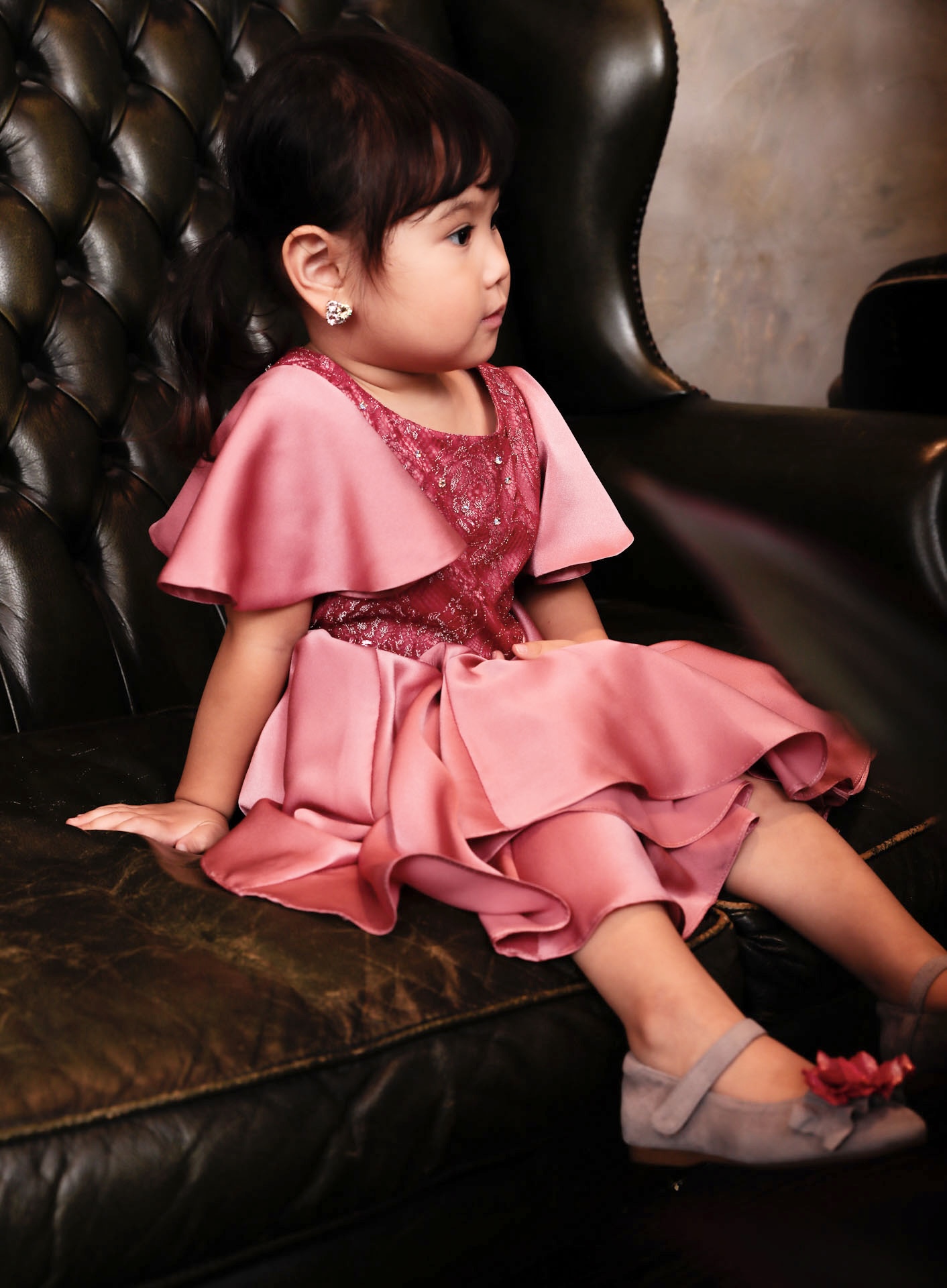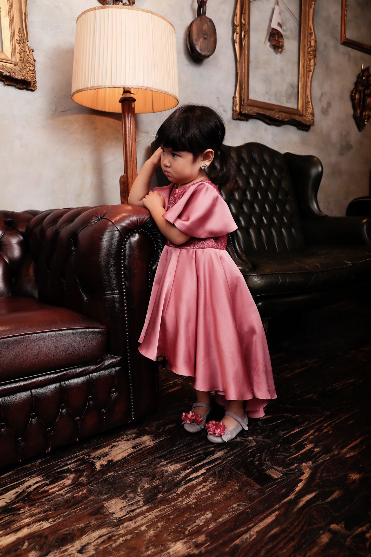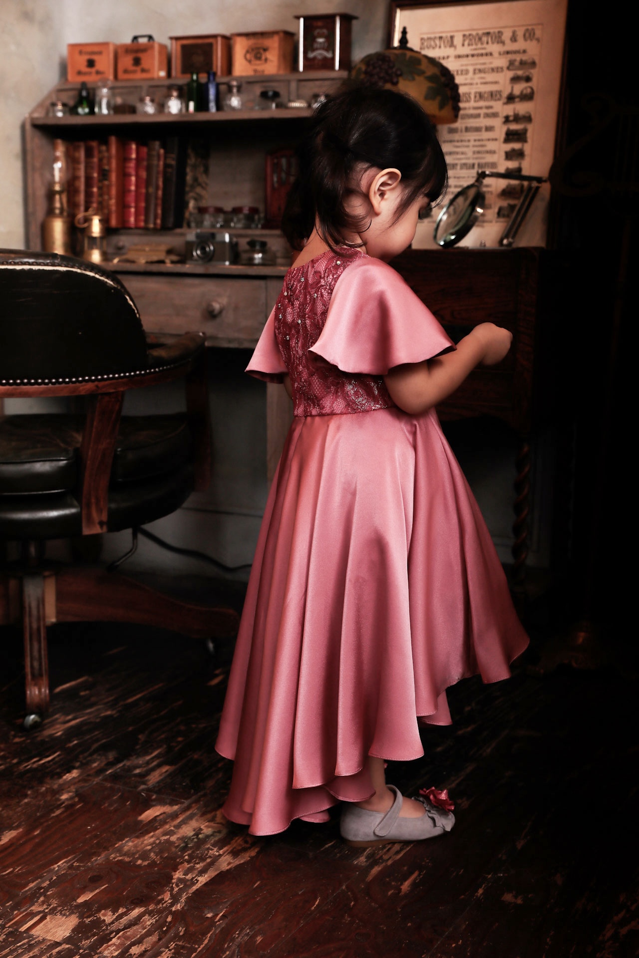 前はひざ丈、後ろは床上がり5~6cmくらいに設定しています。生地が体に張り付かないように内側にチュールのスカートを合わせて2枚重ねにしています。衿もとにはささやかにオーロラのビジューを散らせて、スカート同様に動いたときに綺麗に見えるデザインとなっています。 こちらはセミオーダーで販売しております。カラーとサイズを選んでお問合せページのメールにてご注文下さい。モデルは身長95cm、14kgです。100サイズを着用しています。